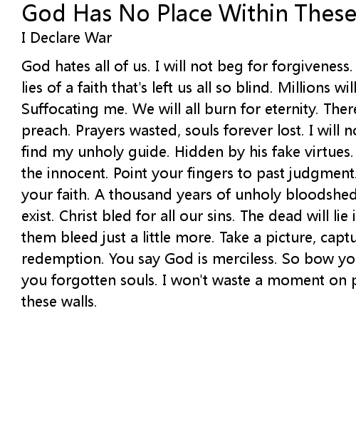God hates all of us. I will not beg for forgiveness. You will all choke on your lies of a faith that's left us all so blind. Millions will not survive. Survive. Suffocating me. We will all burn for eternity. There is no substance to what you preach. Prayers wasted, souls forever lost. I will not look towards the sky to find my unholy guide. Hidden by his fake virtues. Divided by faith. Slaughter the innocent. Point your fingers to past judgment. You are shallow and so is your faith. A thousand years of unholy bloodshed. And for a faith that cannot exist. Christ bled for all our sins. The dead will lie in the streets, so let them bleed just a little more. Take a picture, capture this moment. This is my redemption. You say God is merciless. So bow your head with the masses. To save you forgotten souls. I won't waste a moment on prayer. God has no place within these walls. |