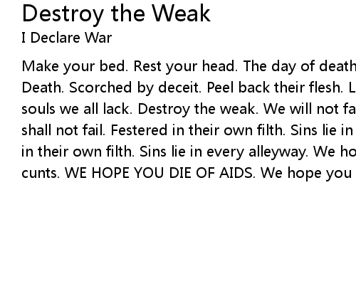 | Make your bed. Rest your head. The day of death. Save your very last breath. Death. Scorched by deceit. Peel back their flesh. Leave not one heartbeat. These souls we all lack. Destroy the weak. We will not fail. Weed out the weak. I shall not fail. Festered in their own filth. Sins lie in every alley. Festered in their own filth. Sins lie in every alleyway. We hope you die. You fucking cunts. WE HOPE YOU DIE OF AIDS. We hope you die. You fucking cunts. |