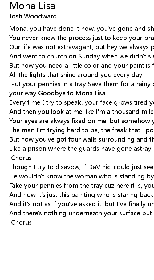 Put your pennies in a tray Save them for a rainy day And it's off you go and on your way Goodbye to Mona Lisa |