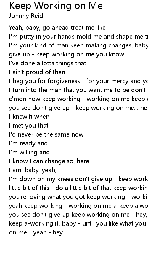 I'm down on my knees don't give up - keep working on me... yeah yeah, do a little bit of this - do a little bit of that keep working on me, baby, till you're loving what you got keep working - working on me keep working - working, yeah keep working - working on me a-keep a working it, baby till you like what you see don't give up keep working on me - hey, hey keep working - working on me keep a-working it, baby - until you like what you see don't give up keep working on me... yeah - hey |