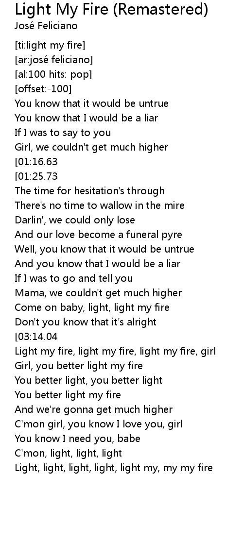 | [02:50.36] | Light my fire, light my fire, light my fire, girl |