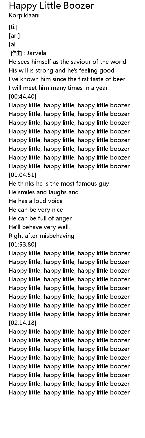 | [00:59.56] | Happy little, happy little, happy little boozer |