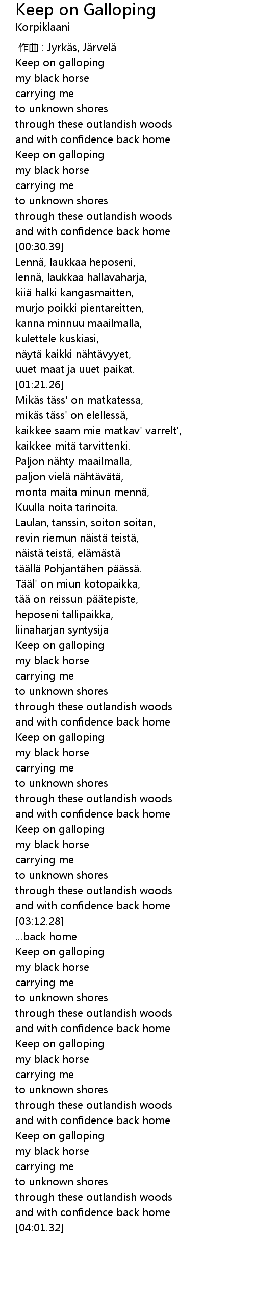 | [00:57.21] | Lennä, laukkaa heposeni, |