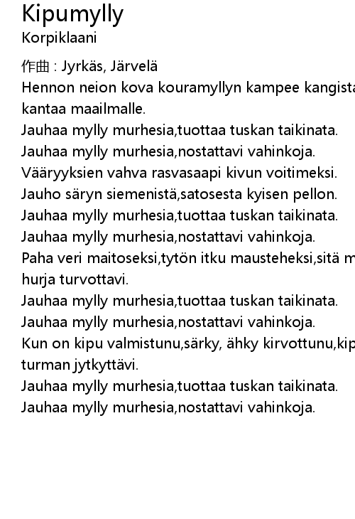| Kun on kipu valmistunu, s rky, hky kirvottunu, kipumylly jo uutta jauhaa, uuen turman jytkytt vi. | |