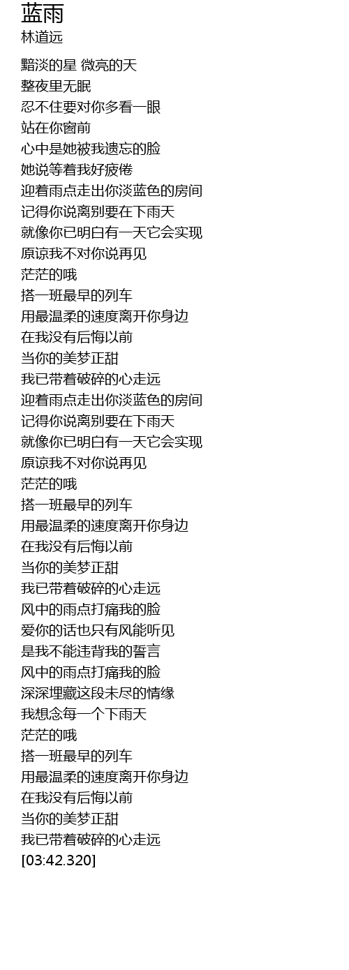 | [00:51.960] | jì de nǐ shuō lí bié yào zài xià yǔ tiān |