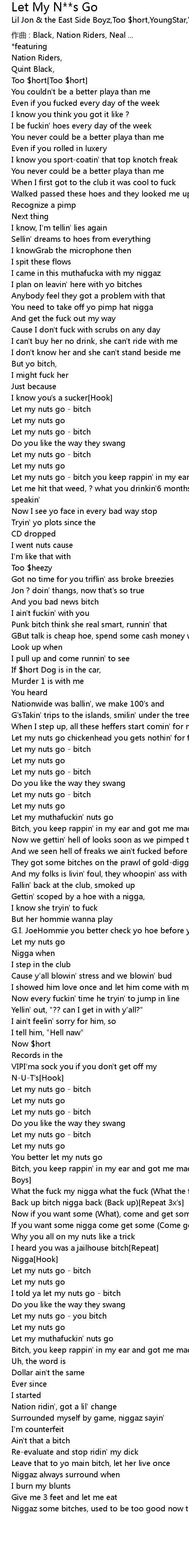 | Let my nuts go - bitch you keep rappin' in my ear and got me mad as hell | |