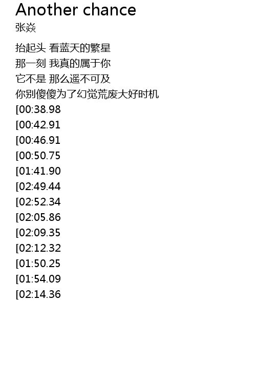 | [03:08.76][02:52.34][02:01.96][01:45.77][00:59.14] | YOU STILL HAVE ANOTHER CHANCE |