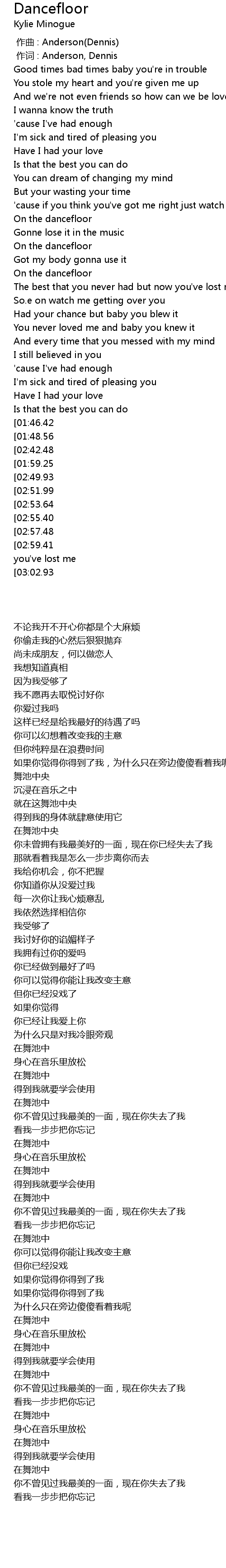 | [03:05.69][02:49.93][02:35.40][02:16.13][02:00.45] | On the dancefloor |