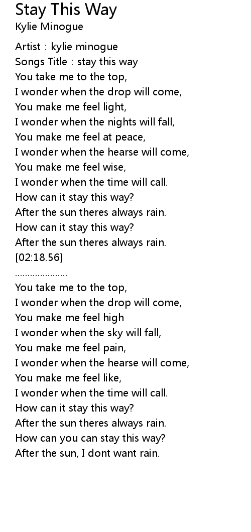 | [00:04.00] | Songs Title:stay this way |