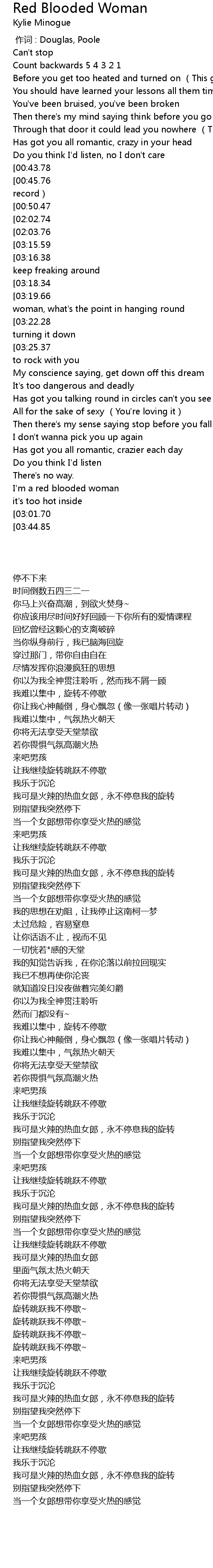 | [03:33.35][03:19.66][02:24.49][02:10.60][01:15.33][01:01.67] | I' m a red blooded woman, what' s the point in hanging round |