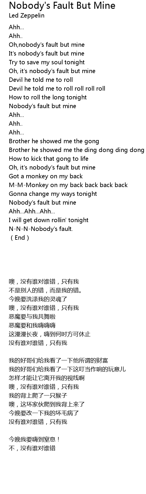 | [01:18.260] | Oh, nobody' s fault but mine |