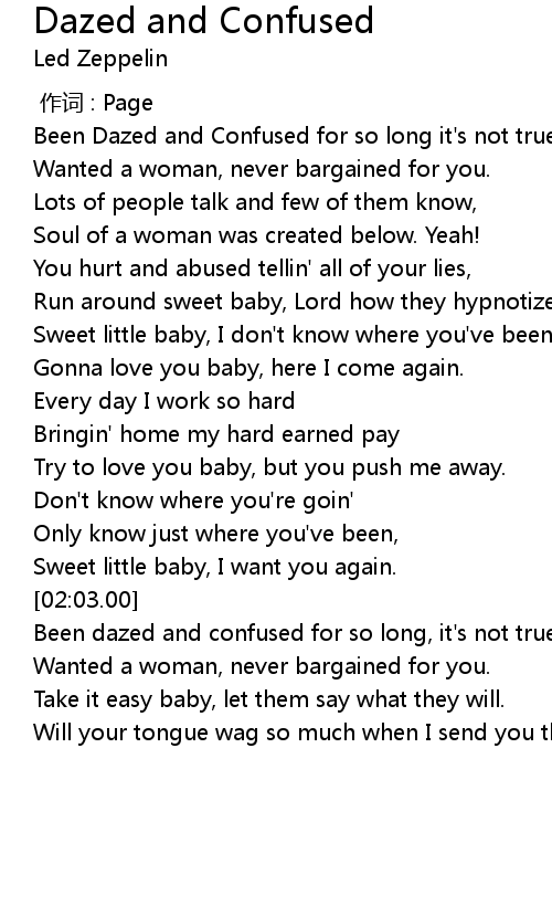 | [00:13.00] | Been Dazed and Confused for so long it's not true, |