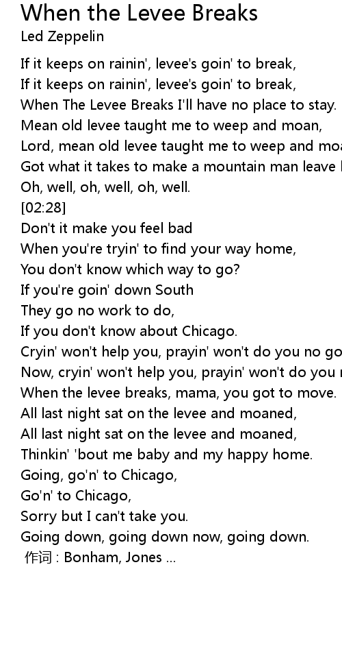 | [01:37] | When The Levee Breaks I'll have no place to stay. |