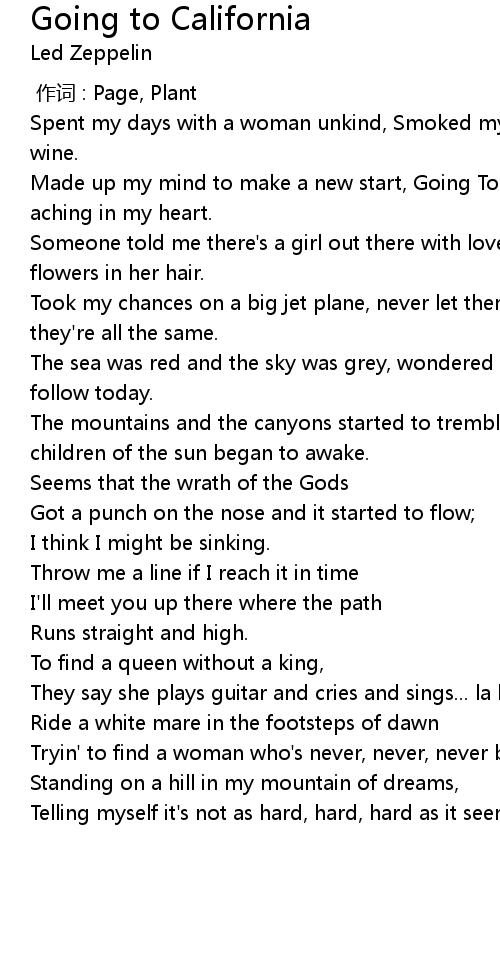 | [00:23.50] | Made up my mind to make a new start, Going To California with an aching in my heart. |