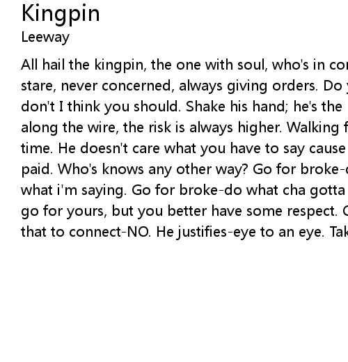 All hail the kingpin, the one with soul, who's in control. With the poker face stare, never concerned, always giving orders. Do you know this man? Well if you don't I think you should. Shake his hand; he's the modern day robin hood. Walk along the wire, the risk is always higher. Walking fine lines helps you pass the time. He doesn't care what you have to say cause he knows that he's getting paid. Who's knows any other way? Go for broke-do what cha gotta do. You know what i'm saying. Go for broke-do what cha gotta do. You know what I say. You can go for yours, but you better have some respect. Cause you don't want a man like that to connect-NO. He justifies-eye to an eye. Take his side or go for a ride |