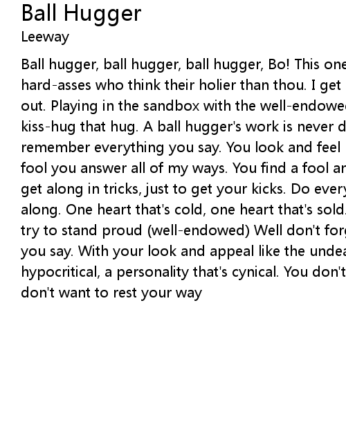 Ball hugger, ball hugger, ball hugger, Bo! This one goes out to all the hard-asses who think their holier than thou. I get a kick out of you when I go out. Playing in the sandbox with the well-endowed. OH SO PROUD. Kiss that kiss-hug that hug. A ball hugger's work is never done. Well don't forget we remember everything you say. You look and feel like you have lost ya way. Like a fool you answer all of my ways. You find a fool and live for another day. You get along in tricks, just to get your kicks. Do everything I said just to get along. One heart that's cold, one heart that's sold. Hey lets watch that punk try to stand proud (well-endowed) Well don't forget we remember everything that you say. With your look and appeal like the undead. One heart that's hypocritical, a personality that's cynical. You don't want to rest yet, you don't want to rest your way |