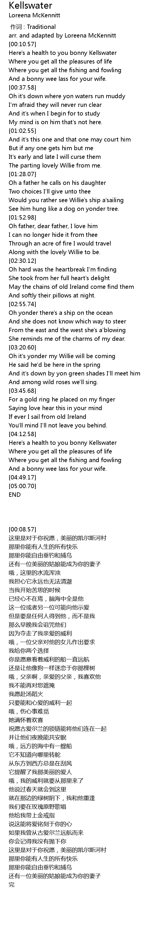 | [00:12.57] | Here' s a health to you bonny Kellswater |