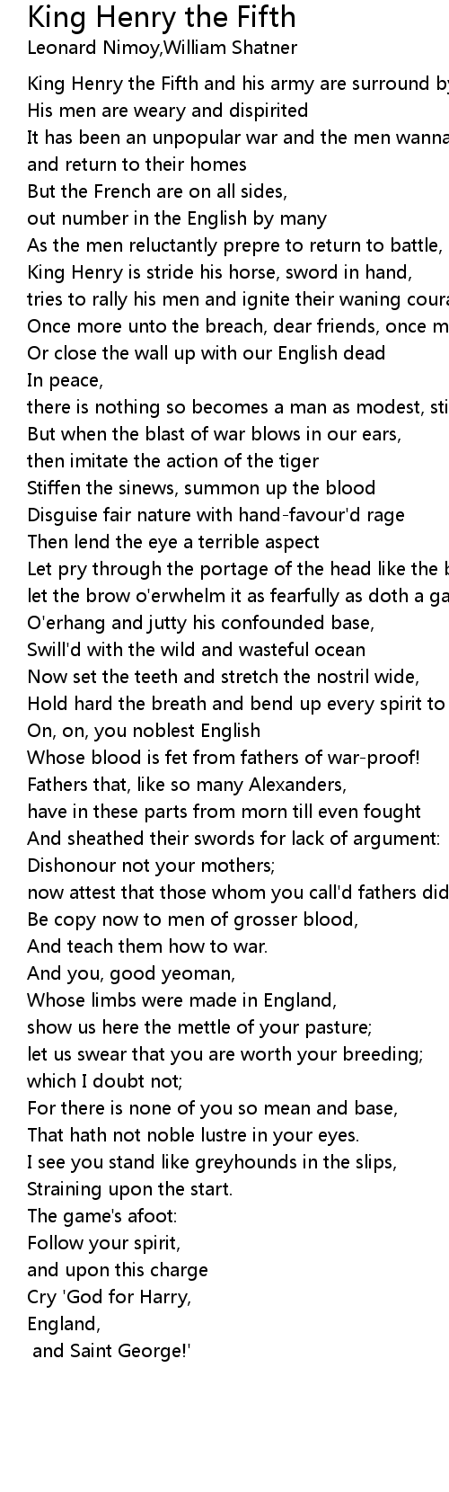 | [00:28.20] | King Henry the Fifth and his army are surround by the enemy |