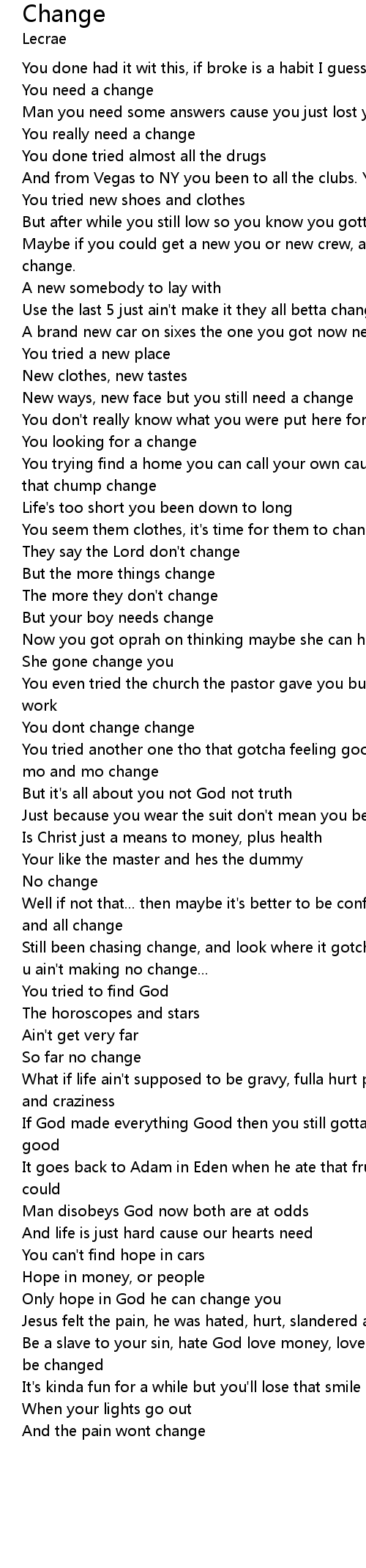 | Still been chasing change, and look where it gotchu depressed ain't a thang not u ain't making no change... | |