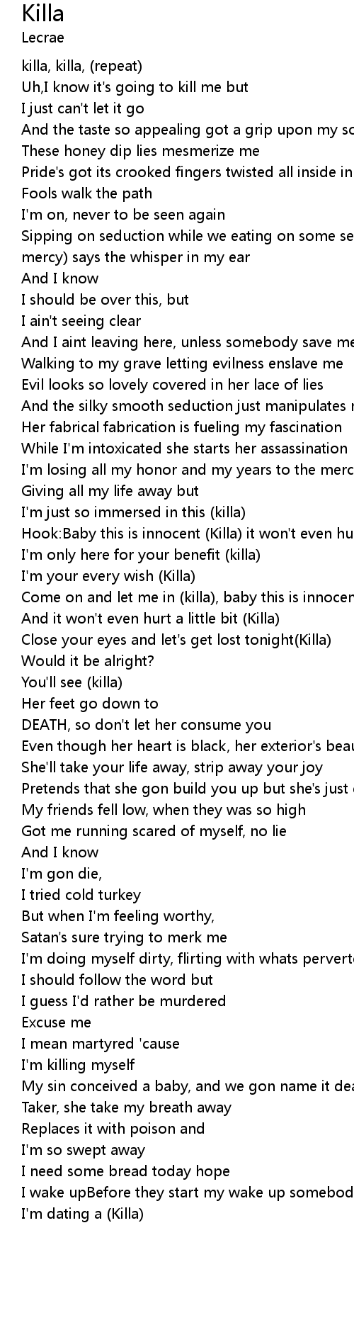 | Hook:Baby this is innocent (Killa) it won't even hurt a little bit (Killa) | |
