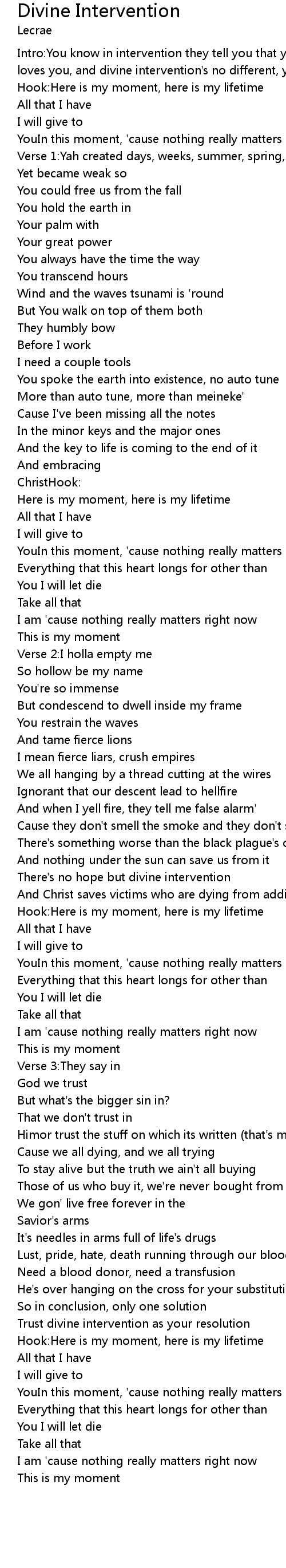 | Intro:You know in intervention they tell you that you're hurting somebody who loves you, and divine intervention's no different, yea, the moment is now | |