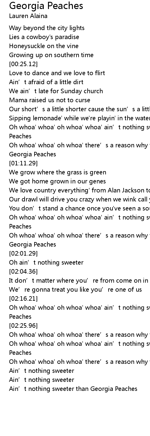 | [02:18.59] | Oh whoa' whoa' oh whoa' whoa' ain’t nothing sweeter than Georgia Peaches |