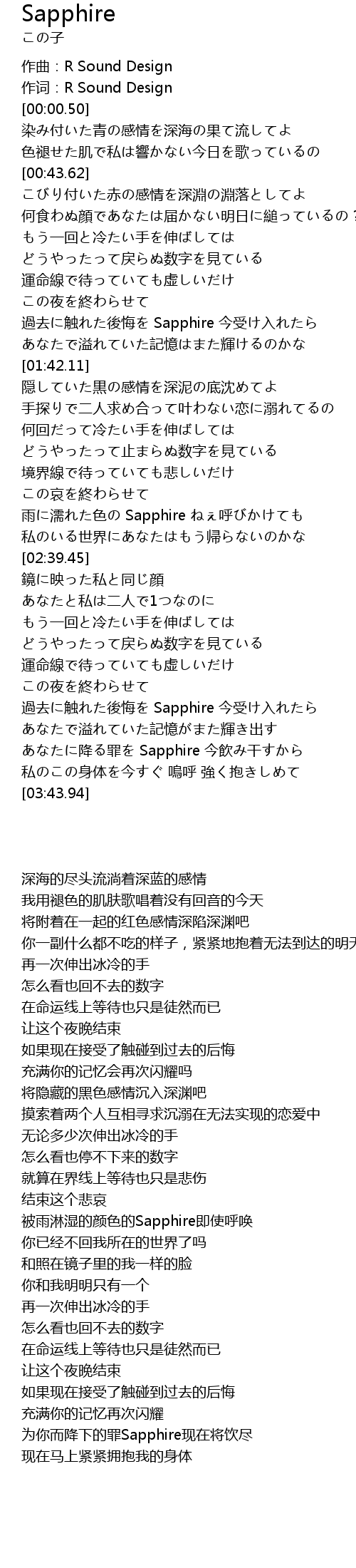 | [03:26.24] | あなたに降る罪を Sapphire 今飲み干すから |