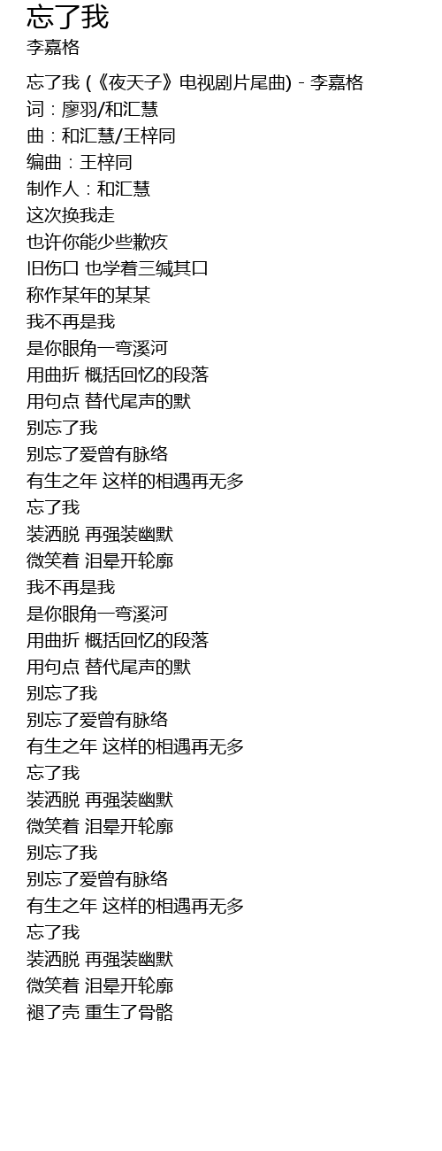 | [00:00.00] | 忘了我 (《夜天子》电视剧片尾曲) - 李嘉格 |