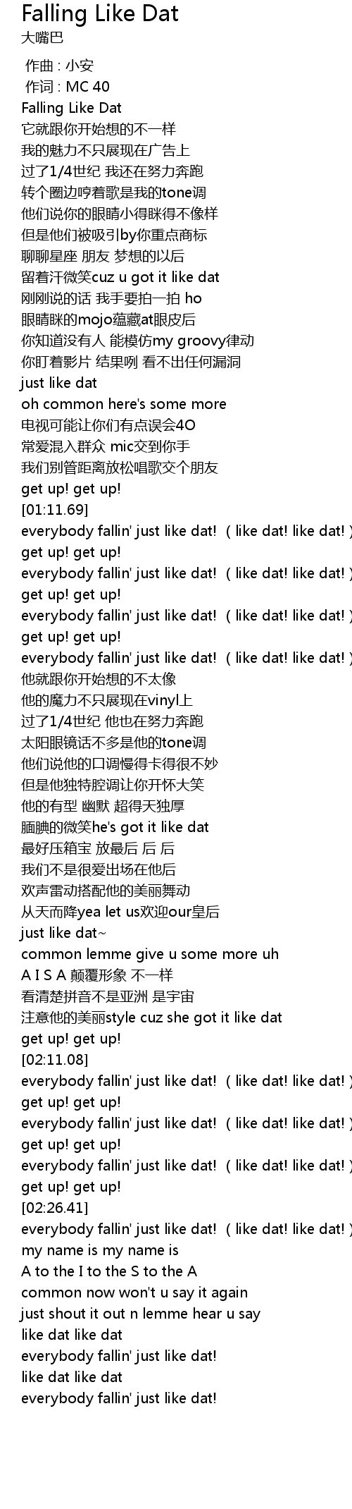 | [01:27.67] | everybody fallin' just like dat! (like dat! like dat!) |