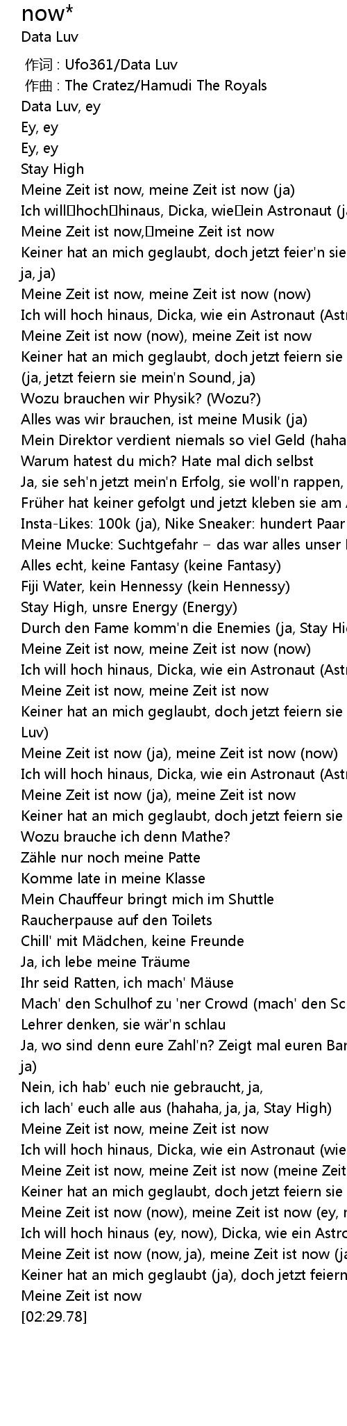 | [02:14.23] | Meine Zeit ist now (now), meine Zeit ist now (ey, now) |