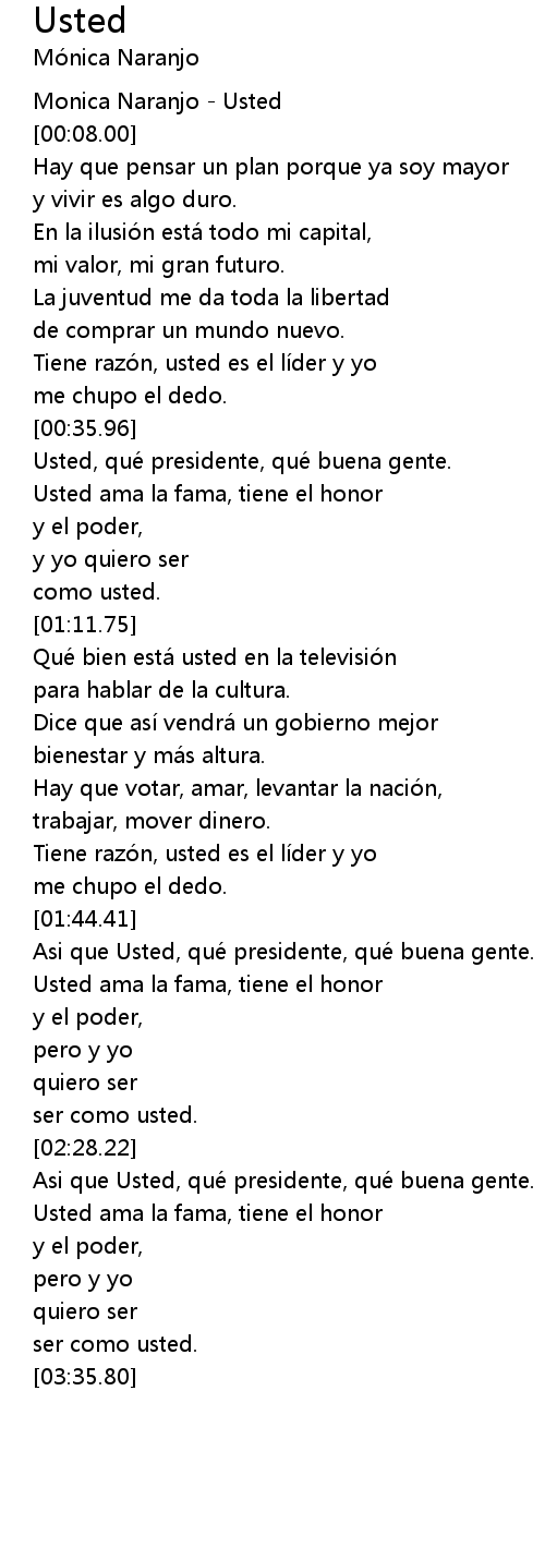 | [01:50.87] | Asi que Usted, que presidente, que buena gente. |