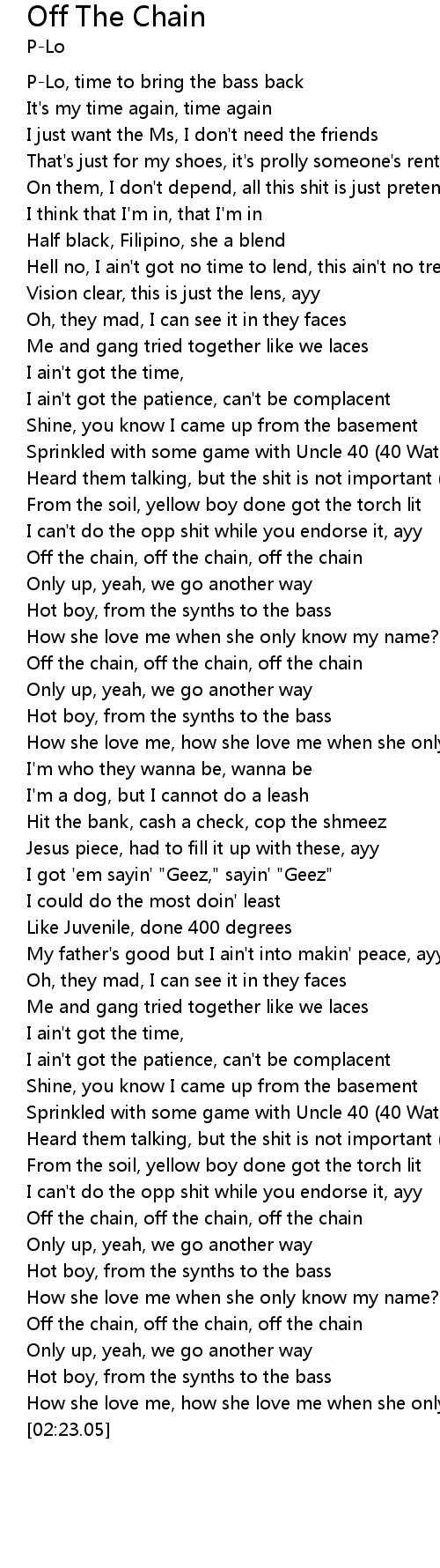 | [02:03.30] | Off the chain, off the chain, off the chain |