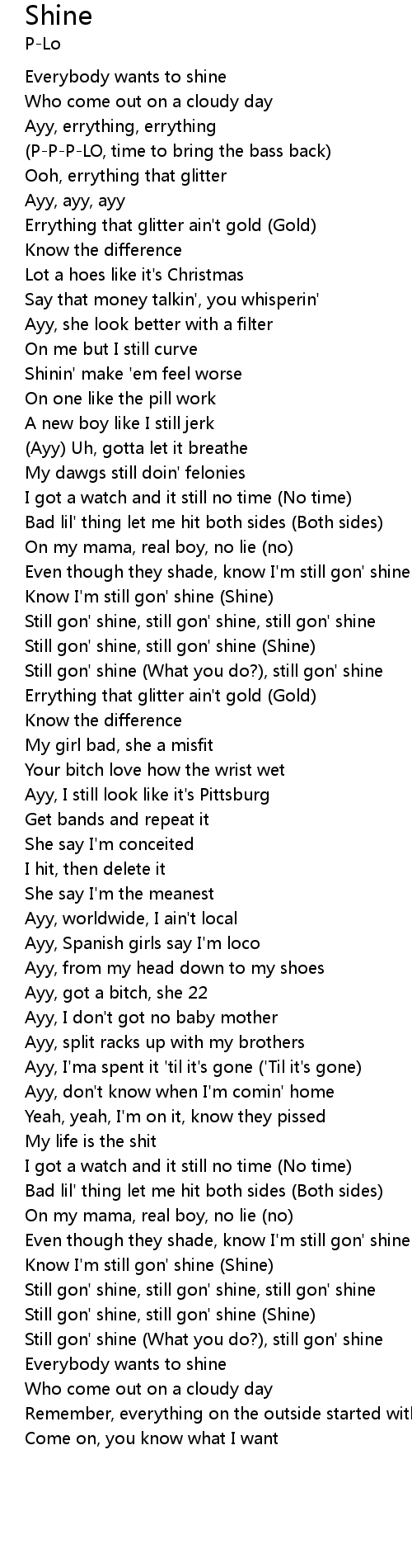 | [01:05.35] | Still gon' shine, still gon' shine (Shine) |