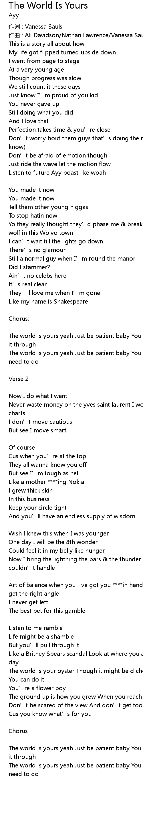 | The world is yours yeah Just be patient baby You gone make it baby You gone see it through | |