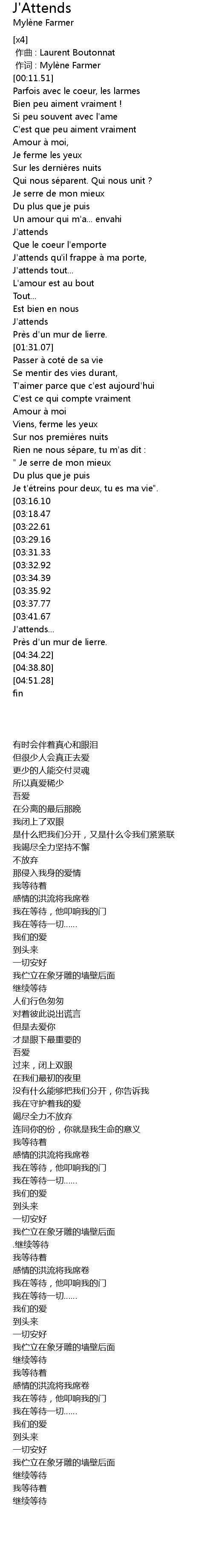 | [04:01.78][03:35.92][02:43.73] | J'attends |