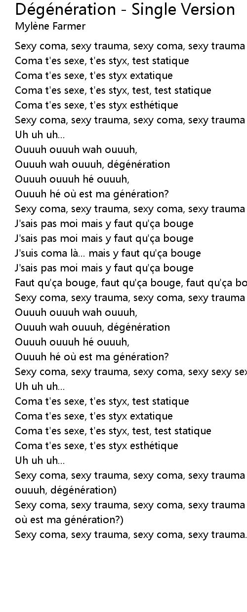 | Sexy coma, sexy trauma, sexy coma, sexy trauma Ouuuh ouuuh wah ouuuh, Ouuuh wah ouuuh, dé gé né ration | |