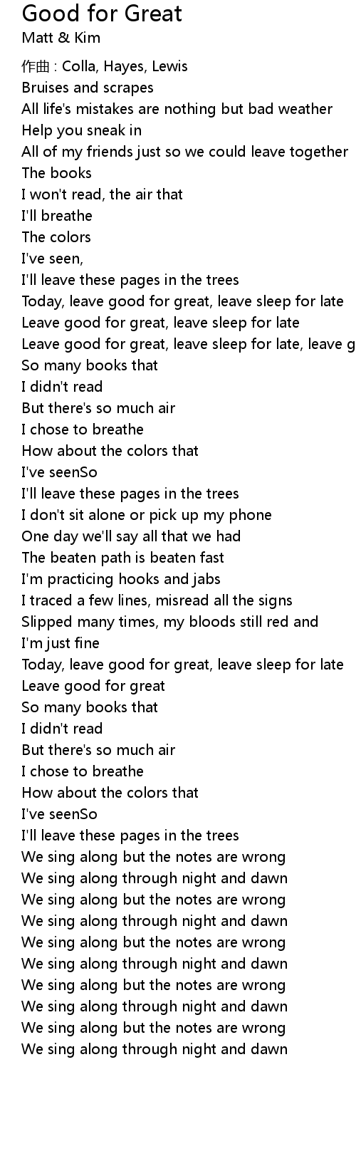 | Leave good for great, leave sleep for late, leave good | |