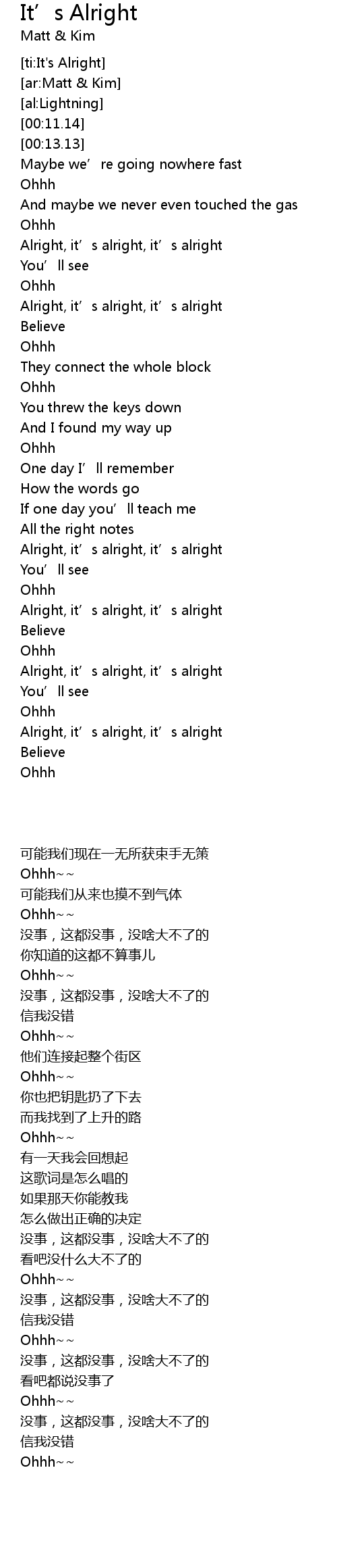 | [03:02.74] | Alright, it' s alright, it' s alright |