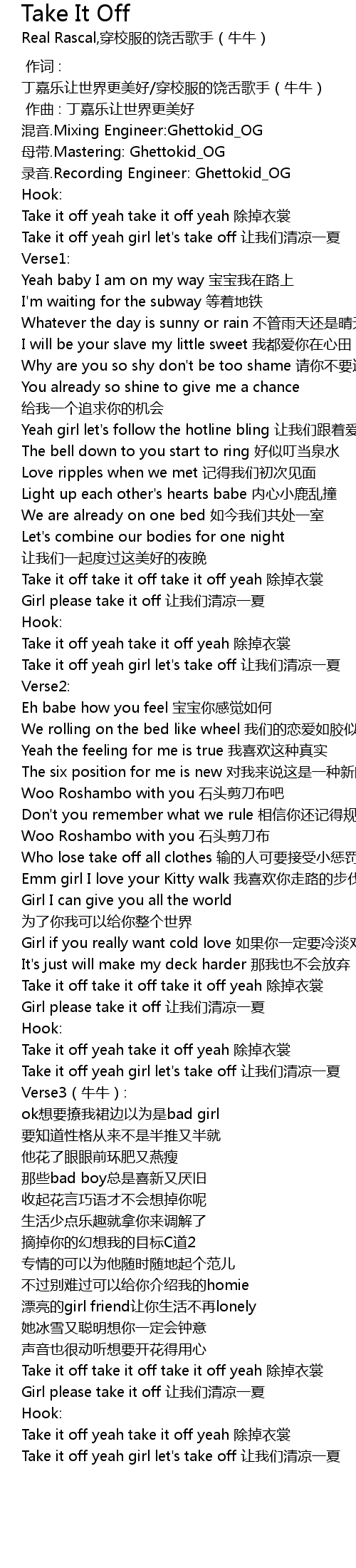 | [00:10.689] | Take it off yeah take it off yeah chú diào yī shang |