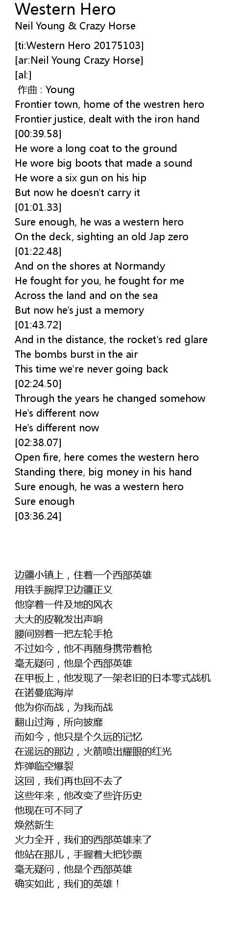 | [02:59.76] | Open fire, here comes the western hero |