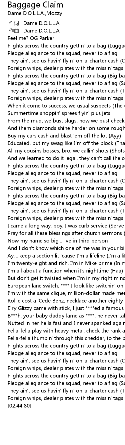 | [02:19.19] | Flights across the country gettin' to a bag (Luggage) |