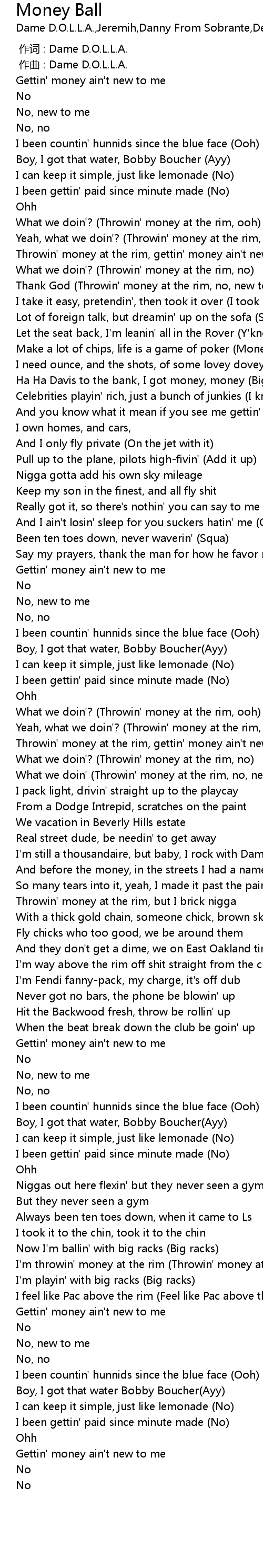 | [00:32.59] | Thank God Throwin' money at the rim, no, new to me |