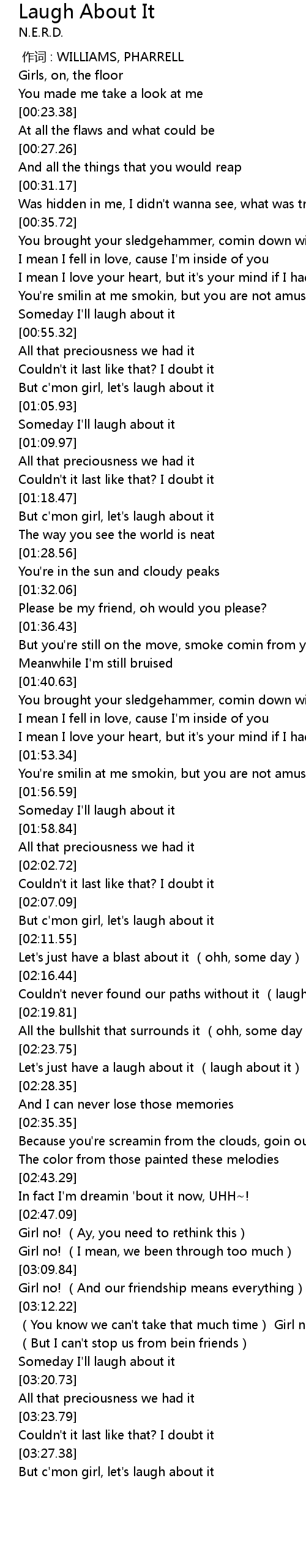 | [03:30.95] | But c'mon girl, let's laugh about it |