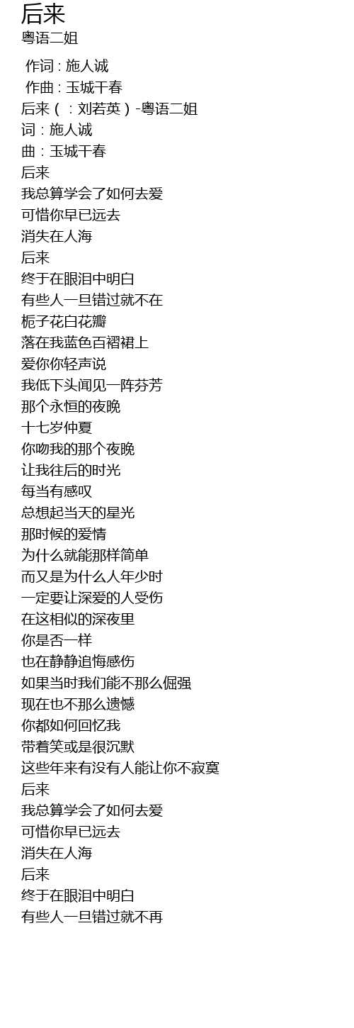 | [00:00.00] | 后来(:刘若英)-粤语二姐 |