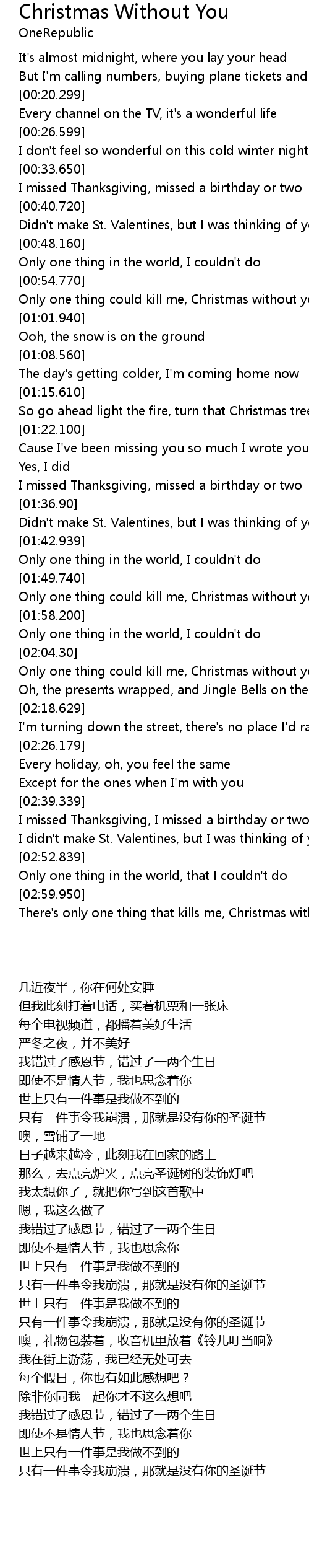 | [03:00.569] | There' s only one thing that kills me, Christmas without you |