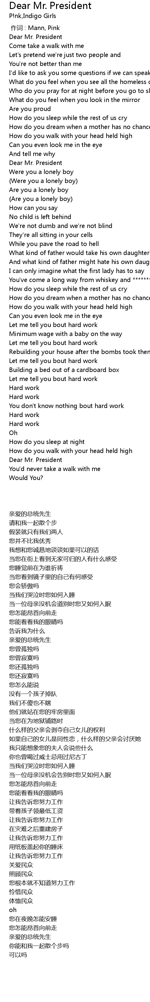 | Song | Dear Mr. President |