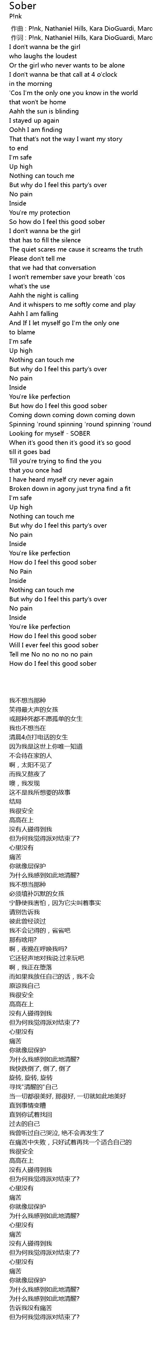 | [00:01.00] | 作词 : P!nk, Nathaniel Hills, Kara DioGuardi, Marcella Araica |