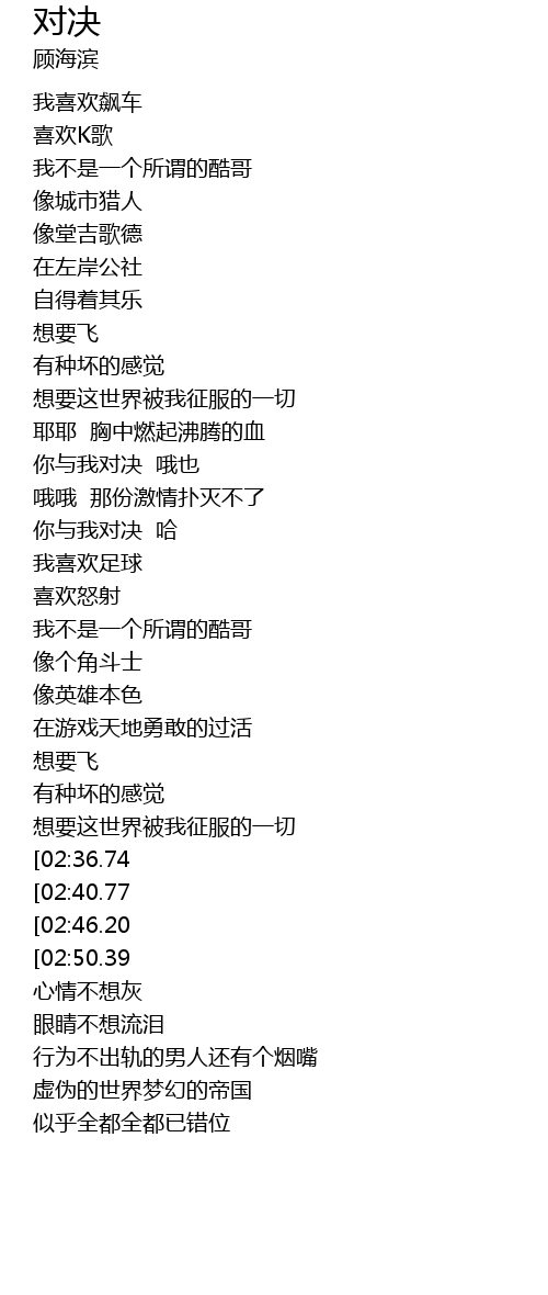 | [03:00.23][02:40.77][02:21.84][01:43.37] | 你与我对决 哦也 |