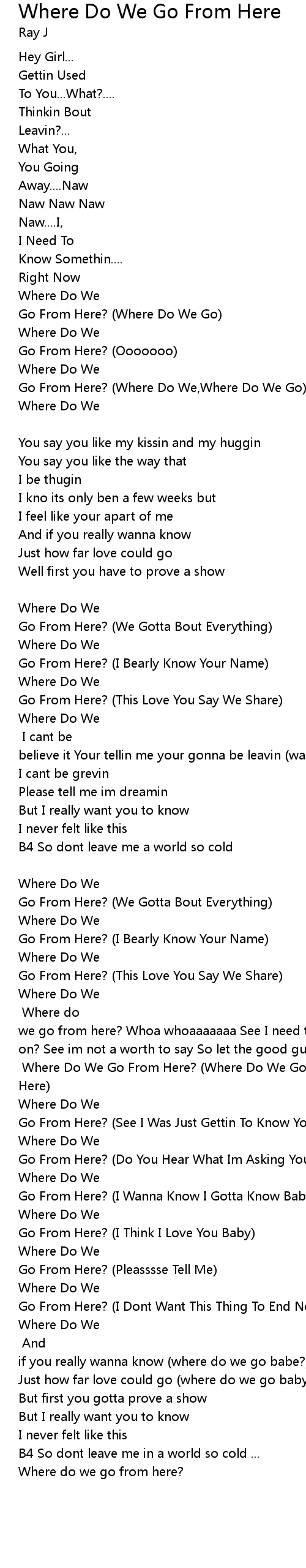 Go From Here? (I Said Lets Talk About It, Lets Talk About Yea [Bridge:] Where do we go from here? Whoa whoaaaaaaa See I need to know Whats going on? Whats going on? See im not a worth to say So let the good guitar play-ya-ya [Guitar Plays] Said I Need To Know!!! [Chorus:] Where Do We Go From Here? (Where Do We Go From Here) |