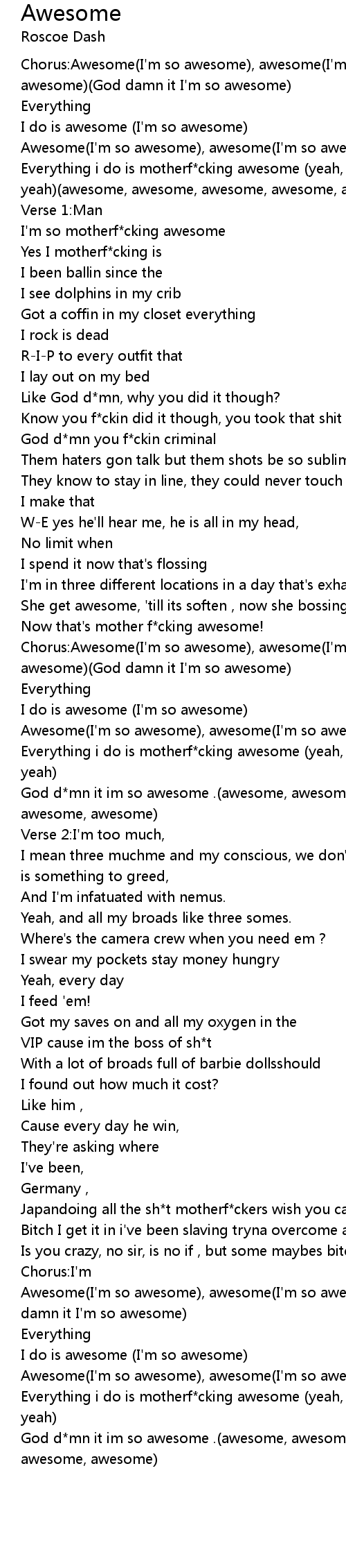 Chorus:Awesome(I'm so awesome), awesome(I'm so awesome), awesome (I'm so awesome)(God damn it I'm so awesome) |